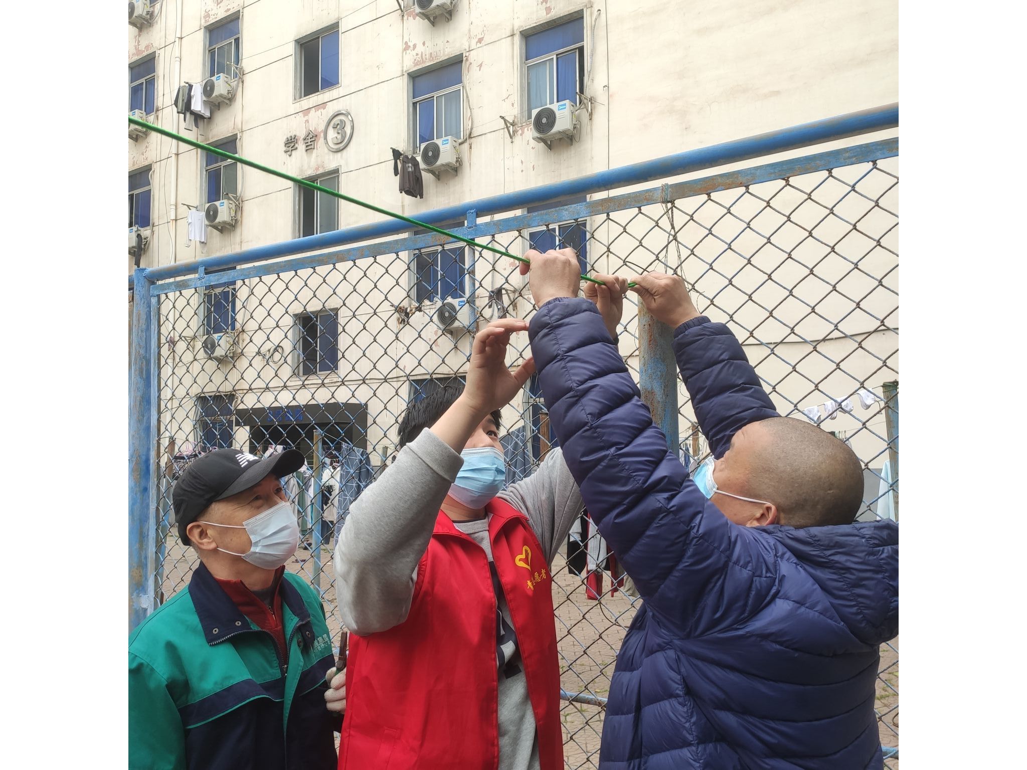 2023年3月20日下午,本科生第五党支部书记张亮亮同志本着“我为师生办实事”的原则,了解到西苑校区男生宿舍3号楼院子内的晾衣绳多数损坏,学生晾衣困难,带领本支部党员、积极分子成员协同电工师傅将院子内的所有晾衣绳重新搭建完毕。