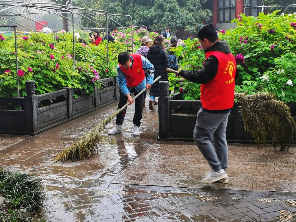 的各位党员志愿者有序进入公园,按计划开展护花行动。本次志愿活动的主要内容为打扫公园卫生、普及牡丹花相关知识。按照时间分为上午和中午两个批次,依次进行。正值周末,公园里人多且热闹。志愿者们忙碌在公园的各个角落,认真细致地清理着杂草和垃圾碎屑。在各位志愿者的引导和提醒下,各位游客文明游览,没有出现随手折花、踩踏草坪等现象。志愿者还向游客们宣传牡丹花的寓意、花语及其他知识,让更多的人爱花护花,为城市增添了文明靓丽的一道风景。