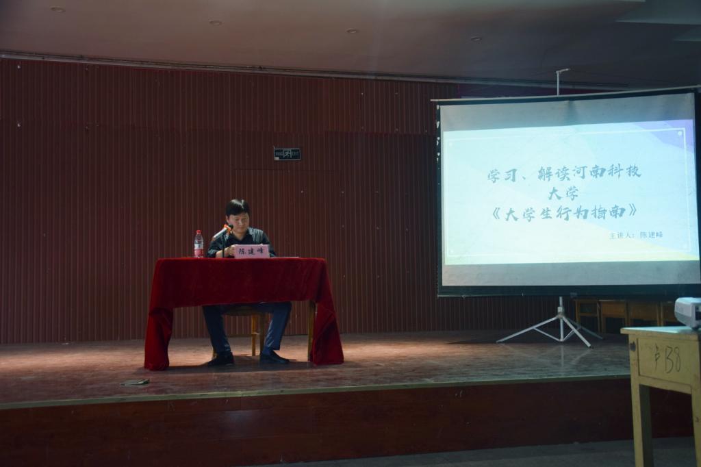 首先,陈书记强调学习《大学生行为指南》的重要性,并指出了学习的重点。接着组织全体同学解读《大学生行为指南》,并从行为管理,纪律管理,安全管理,课外培养等方面为大家做出详细讲解,在整个学习过程中,20级全体学生仔细听讲,认真学习学校的规章制度和各项评优评先的评定办法,并对不清楚的地方及时提问,陈书记也针对同学们提出的问题进行辅导答疑。最后陈书记用精炼的语言进行总结补充,倡导同学们自觉遵守规章制度,培养良好的生活习惯和远大的理想志愿。