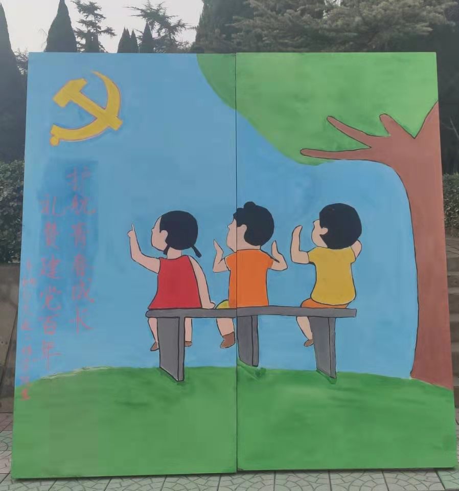 板报向同学们展示了在一个风和日丽、岁月静好的下午,三个少年向党致敬,并围绕着党章展开激烈讨论的画面。板报吸引了许多同学驻足围观。心理健康部通过板报提醒同学们,正是因为无数革命先烈甘洒热血、奉献青春,才有了我们现在和平美好的幸福生活,呼吁同学们积极学习党史,了解党的伟大征程,从中汲取奋进力量,学习顽强拼搏、不懈奋斗的革命精神,向党的百年华诞致敬。