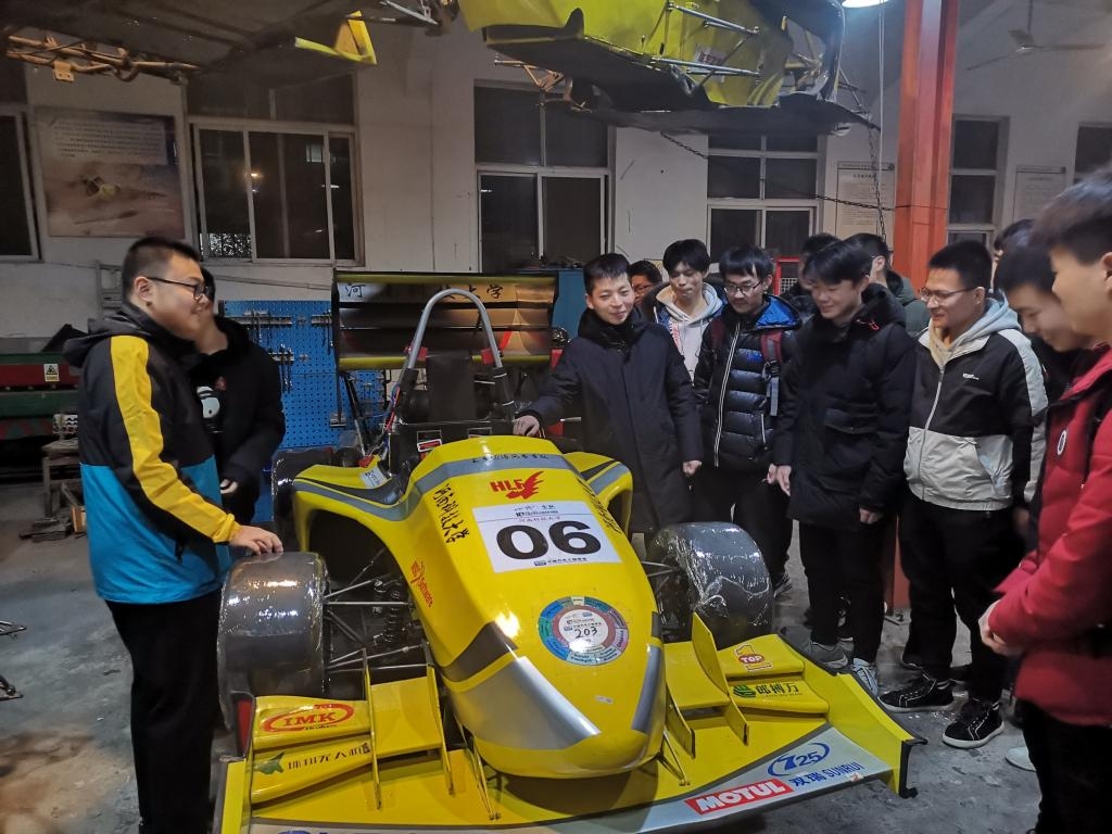 各班同学排成了整齐的队伍在代班长带领下前往车间。踏入车间,车间里有富有线条感的方程式赛车,还有精巧别致的巴哈赛车,深深地吸引了同学们。河洛风赛车队队长高延伟为新生们讲述了河洛风赛车队的光辉战绩,并向大家展示了他们的工作日程和工作内容。