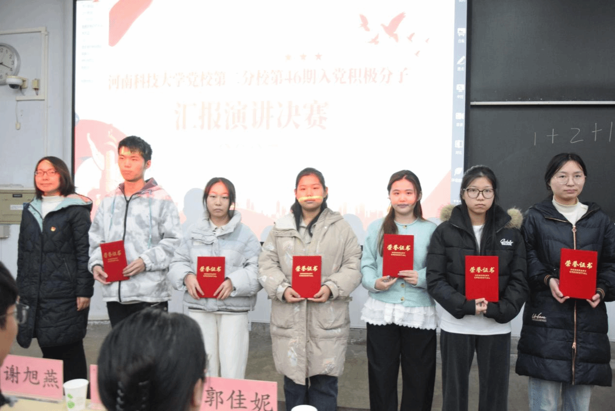 王金垚、范嘉庆、郭嘉乐等十名入党积极分子依次登台演讲,展现青春风采。经评委综合评审打分,最终评选出演讲比赛前三名:王昕月、杜志强、索明媛。郭佳妮为演讲比赛获奖学员颁发荣誉证书。随后,会议宣读本期培训班优秀学员名单:冯江怡、秦岩岩、赵文若、马浩健、徐月、周俊如。李艳红为优秀学员颁发荣誉证书。